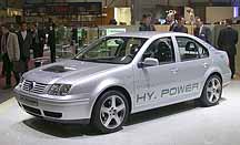 The 2002 VW Bora Hy.Power (or Jetta in the U. S.) was a fuel cell vehicle designed by the Paul Scherrer Institute in Zurich, Switzerland. The Volkswagen Bora HyPower used a relatively low-cost 75 kw hydrogen fuel cell coupled with the power of onboard ultra-capacitors. |