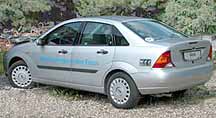 The 2003 Folkecenter Ford Focus is a standard 2-liter Ford Focus that was converted to run on hydrogen gas. The internal combustion engine of the Danish Folkecenter Ford Focus burns cleanly with 10 times less cost than a comparable car using a fuel cell. The car is unique in that it is dual-fuel and starts up using gasoline, then switches over at the appropriate revolutions per minute to hydrogen. |
