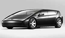 The 2003 Nissan Effis compact commuter fuel cell car uses a Super Motor design to distribute power independently to right and left wheels, enhancing stability and performance. The fuel cell stack and lithium-ion batteries of the Nissan Effis are sandwiched underneath the floor. |