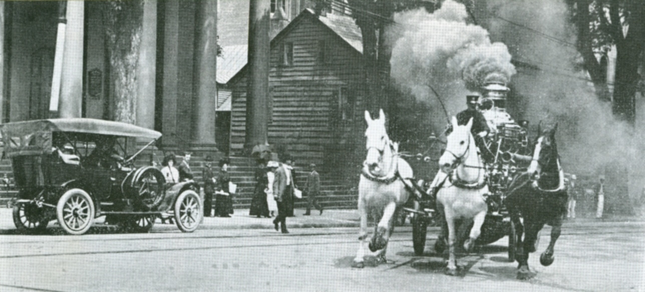 On the way to a fire circa 1910 with a steam fire pump