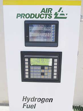 The photo to the left shows the controls on the hydrogen fueling station. The upper panel, from top to bottom, shows Total Sale, Quantity and Price. Note the current price here is $4.99 per gallon equivalent or the same price per kilogram (Kg).