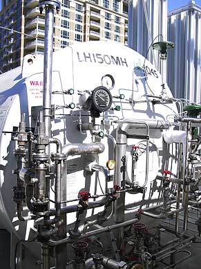 The photographs above show a frontal look at the Air Products hydrogen fueling station along with a “behind the scenes” look at the huge hydrogen tank supplying the station. The hydrogen tank has a large decal on the side stating “Liquid Hydrogen”, which is outside the picture. Presumably, liquid hydrogen is being shipped to this facility and then being turned into gas as needed to refuel the hydrogen cars.