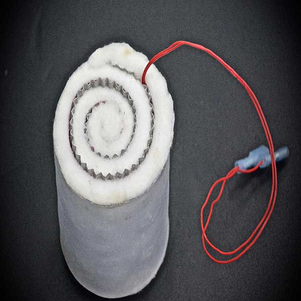 According to NASA, “The CFC technology includes ingenious packaging in its design. Tightly coiling aerogel blanket into a cylinder allows for a larger amount of the storage media (aerogel) to be densely packaged into a manageable geometry. A spirally-integrated conductive membrane also acts as a large area heat exchanger that easily distributes heat through the entire cylinder to discharge the CFC quickly, and can be interfaced to a cooling source to charge it up; this feature also allows the cryogenic fluid to easily penetrate the cylinder for fast charging.”