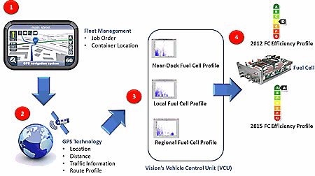 The Vision Industries’ IREx system (see graphic at top of page) is interesting in that it integrates GPS, fleet management software and the Vehicle Control Unit in order to maximize fuel efficiency, time management and profitability on the fly. Optimized profiles are chosen automatically for any given situation a driver may encounter.